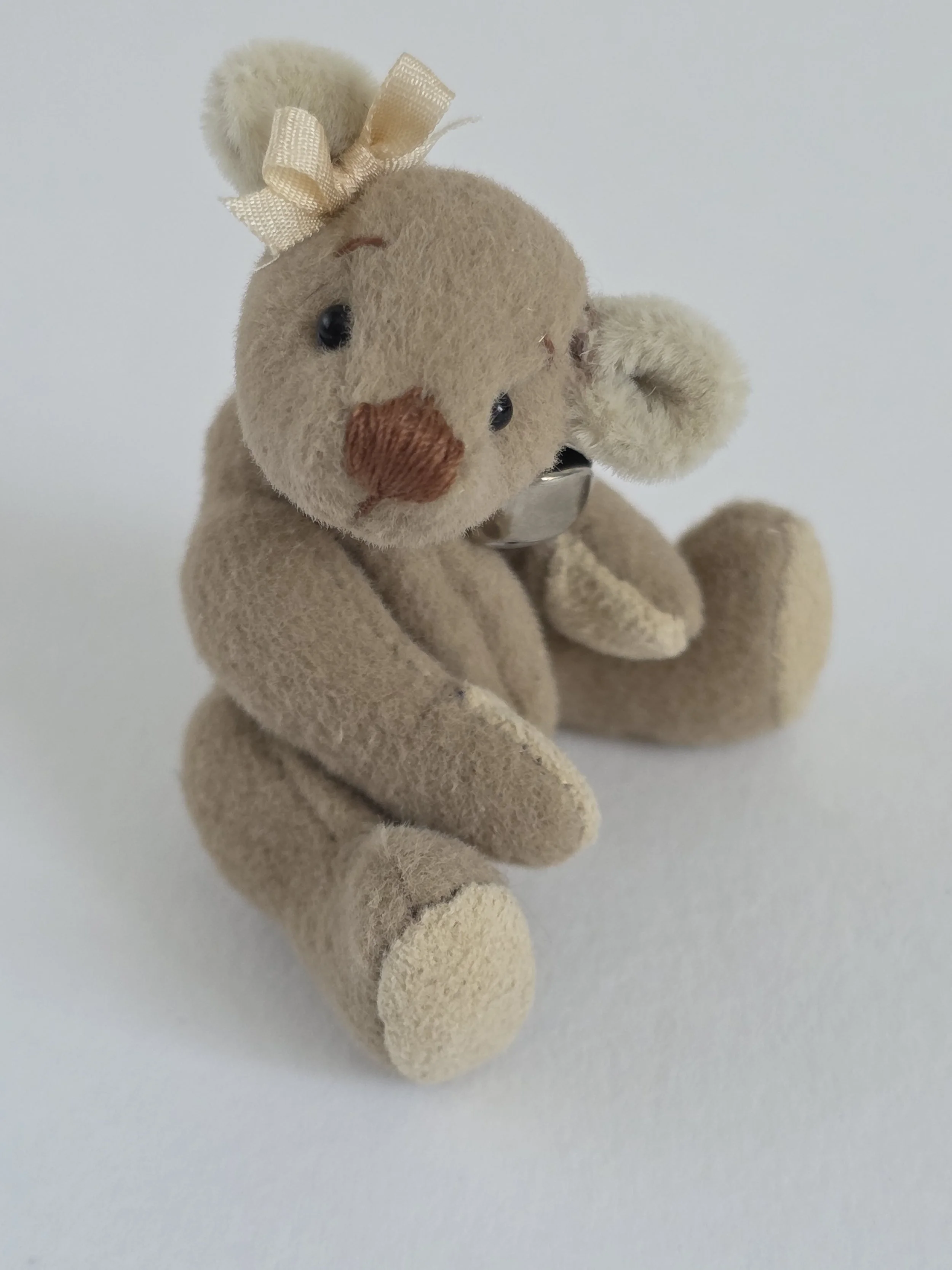 Beatrix is a tiny 2-inch teddy bear made from upholstery fabric, with ultrasuede paws, an embroidered brown nose, and fully articulated limbs that let her strike the sweetest poses. Her softly weighted tummy, filled with fine glass beads, gives her a gentle, lifelike presence that feels tender and precious tiny speck in your hand.
