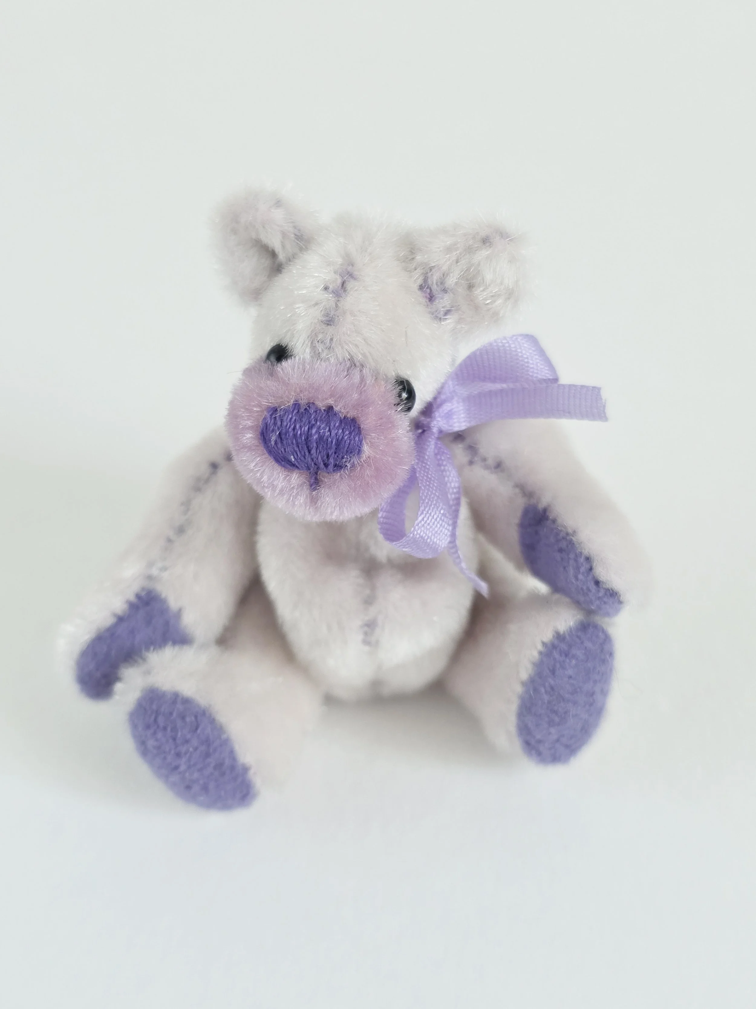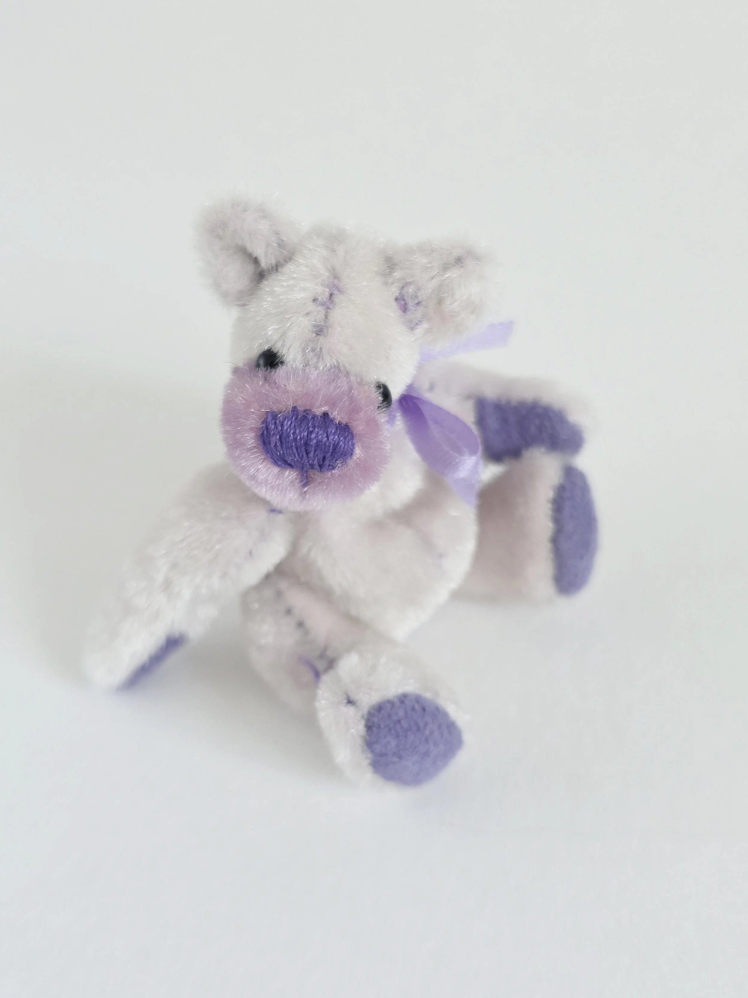 Meet sweet Plumkin. This tiny 2-inch teddy bear is crafted from hand-dyed lavender upholstery fabric with ultrasuede paws, an embroidered dark purple nose, and fully articulated limbs. His softly weighted tummy, filled with fine glass beads, lets him sit with a sweet, lifelike charm.
