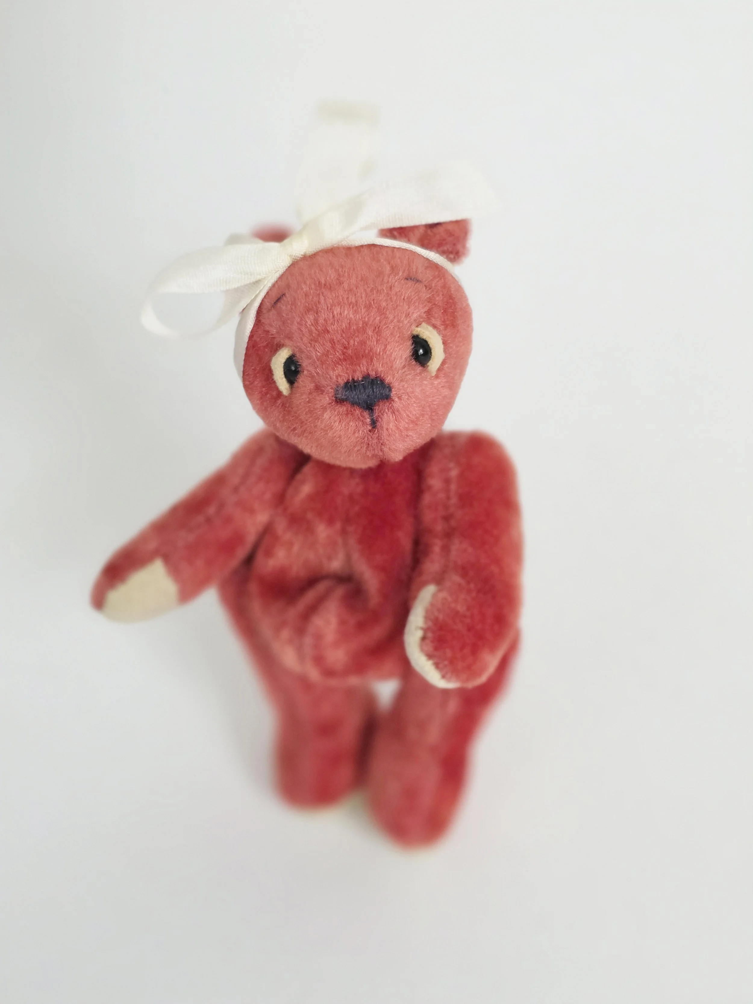 Carmella is 3-inch teddy bear made from a vintage watermelon colored upholstery fabric -no more exists so truly OOAK! (carmine:), with ultrasuede paws, an embroidered black nose like a melon seed, and fully articulated limbs that let her strike the sweetest poses. She has ultra suede eyelids and a silk bow on her head. Her softly weighted tummy, filled with fine glass beads, gives her a gentle, lifelike presence that feels tender and precious in your hand.