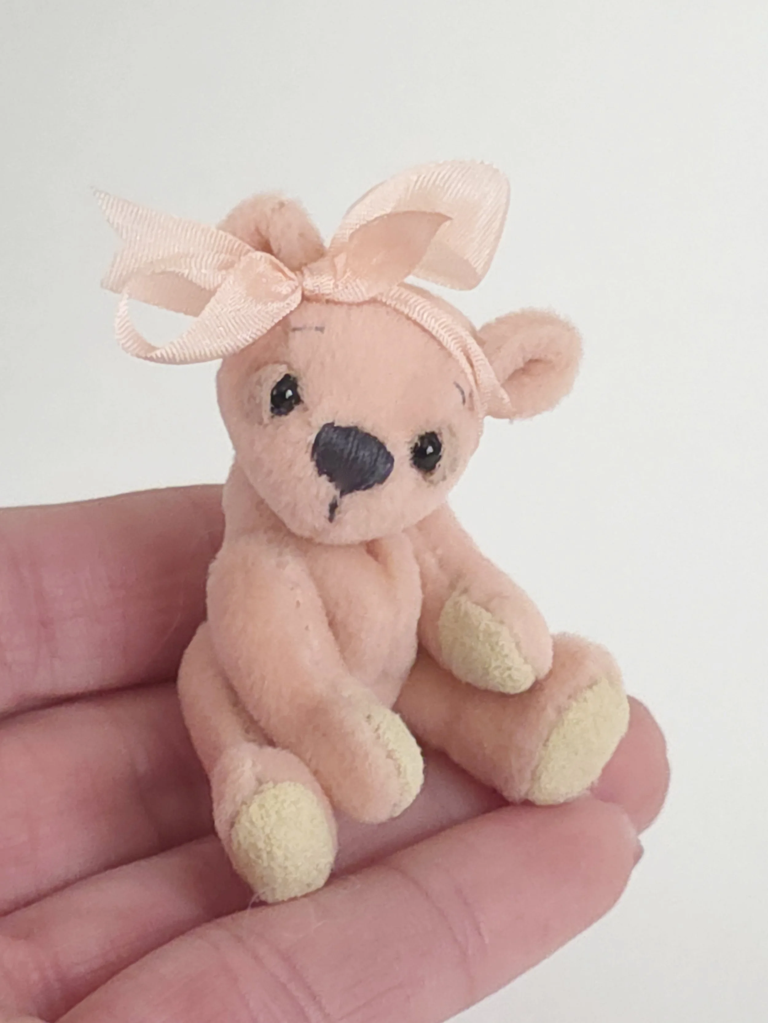 Pippa Puffball is a 4.5-inch 11 cm. teddy bear made from pink sparse mohair, with ultrasuede paws, an embroidered nose, and fully articulated limbs that let her strike the sweetest poses. She has black onyx black bead eyes and a silk bow. Her softly weighted tummy, filled with fine glass beads, gives her a gentle, lifelike presence making her cuddly in your hand!