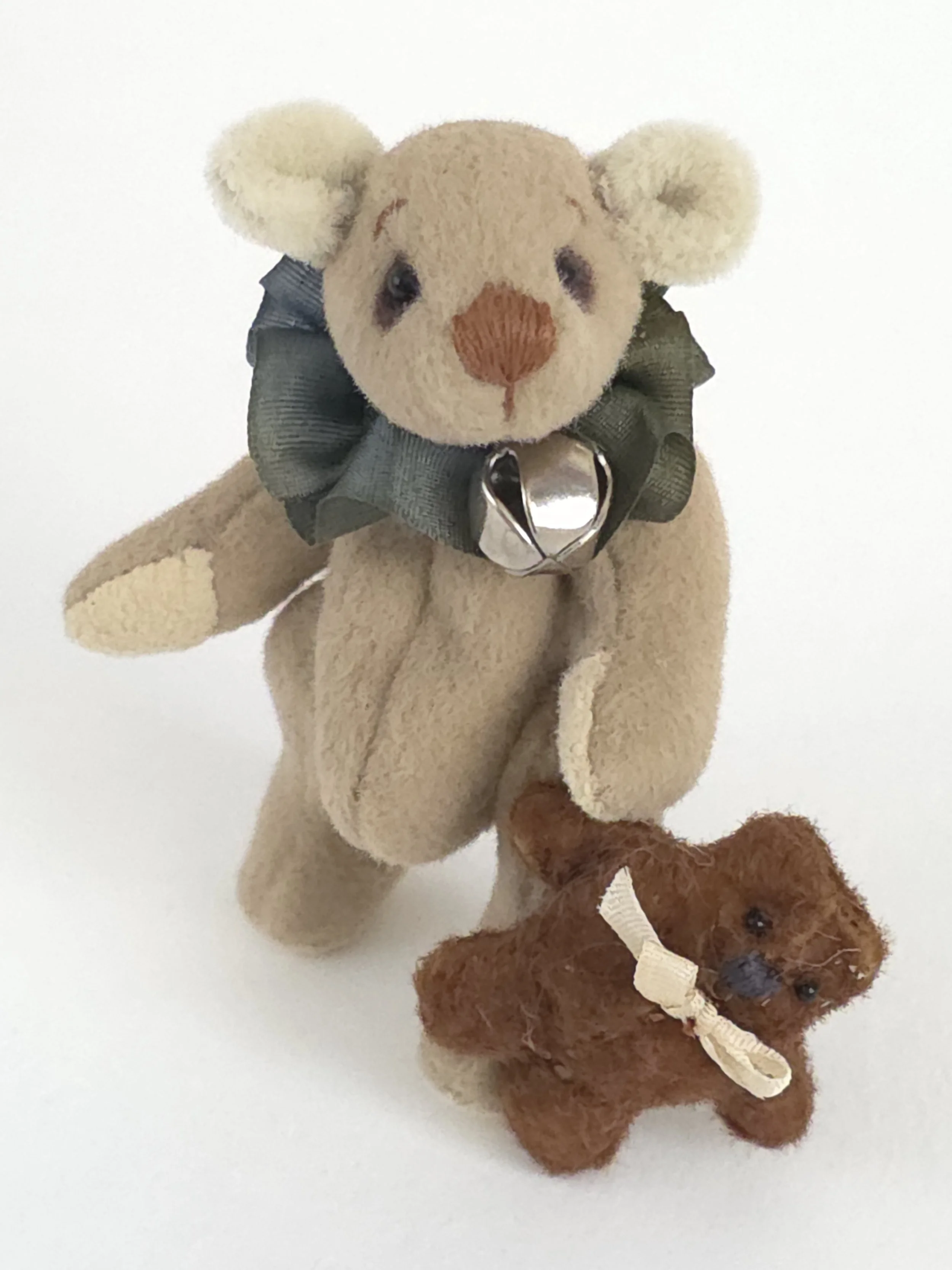 I present to you, teddy bear lover, Blossom and Petal! This petite 2-inch teddy bear is made from creamy upholstery fabric with ultrasuede paws, an embroidered dark blue nose, and fully articulated limbs for gentle posing. Her tummy is softly weighted with fine glass beads, giving her a sweetly grounded, lifelike feel as she cuddles her tiny companion of 3/4”.