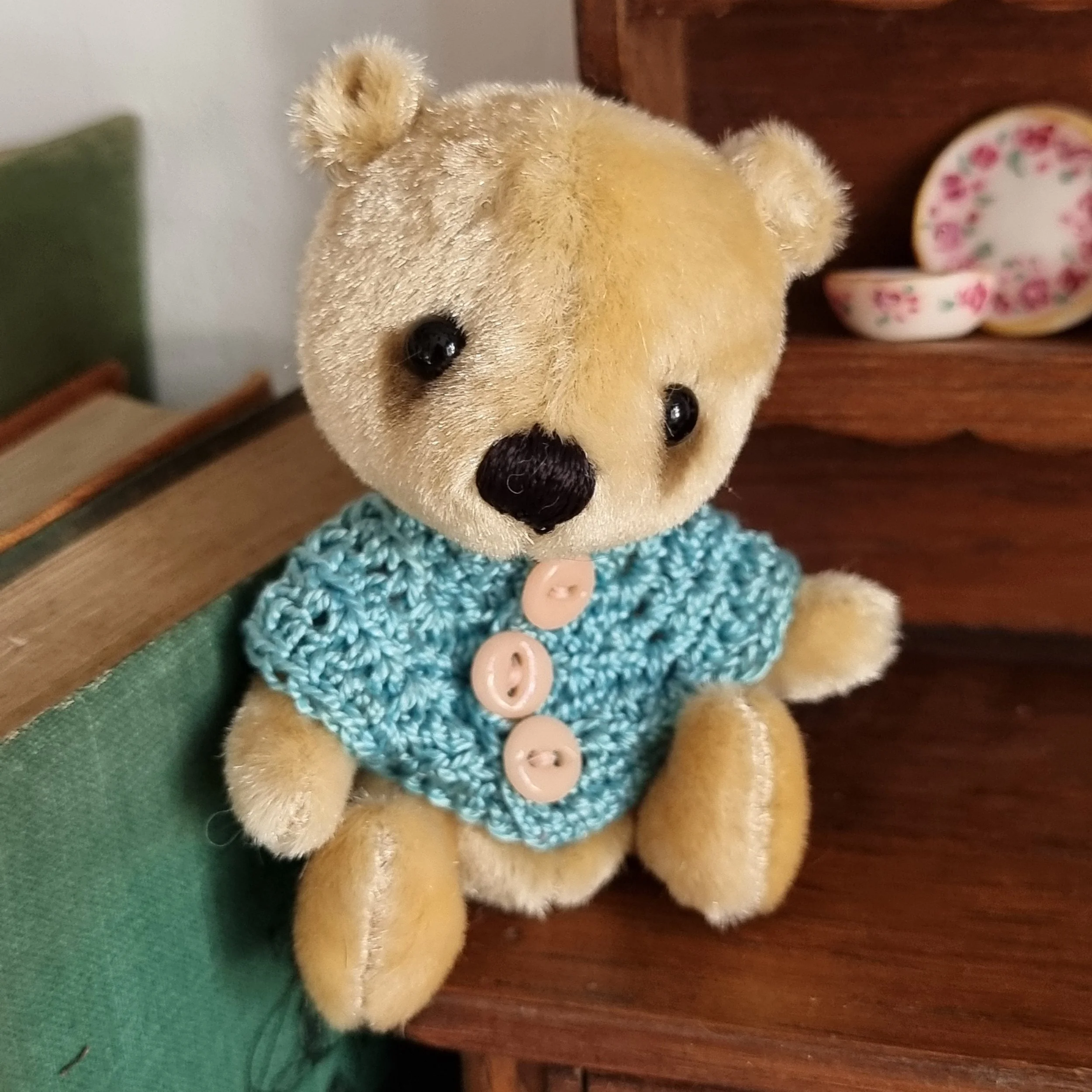 Pembearton is an adorable teddy bear made from soft vintage upholstery fabric in a buttery cream. He is 3” (7 cm). He is hand-sewn and fully jointed with eyes that are black onyx beads. Wearing a hand-crocheted sweater with pink buttons, his stomach isn't polyfil but weighted so he can sit comfortable in his forever person's hand.